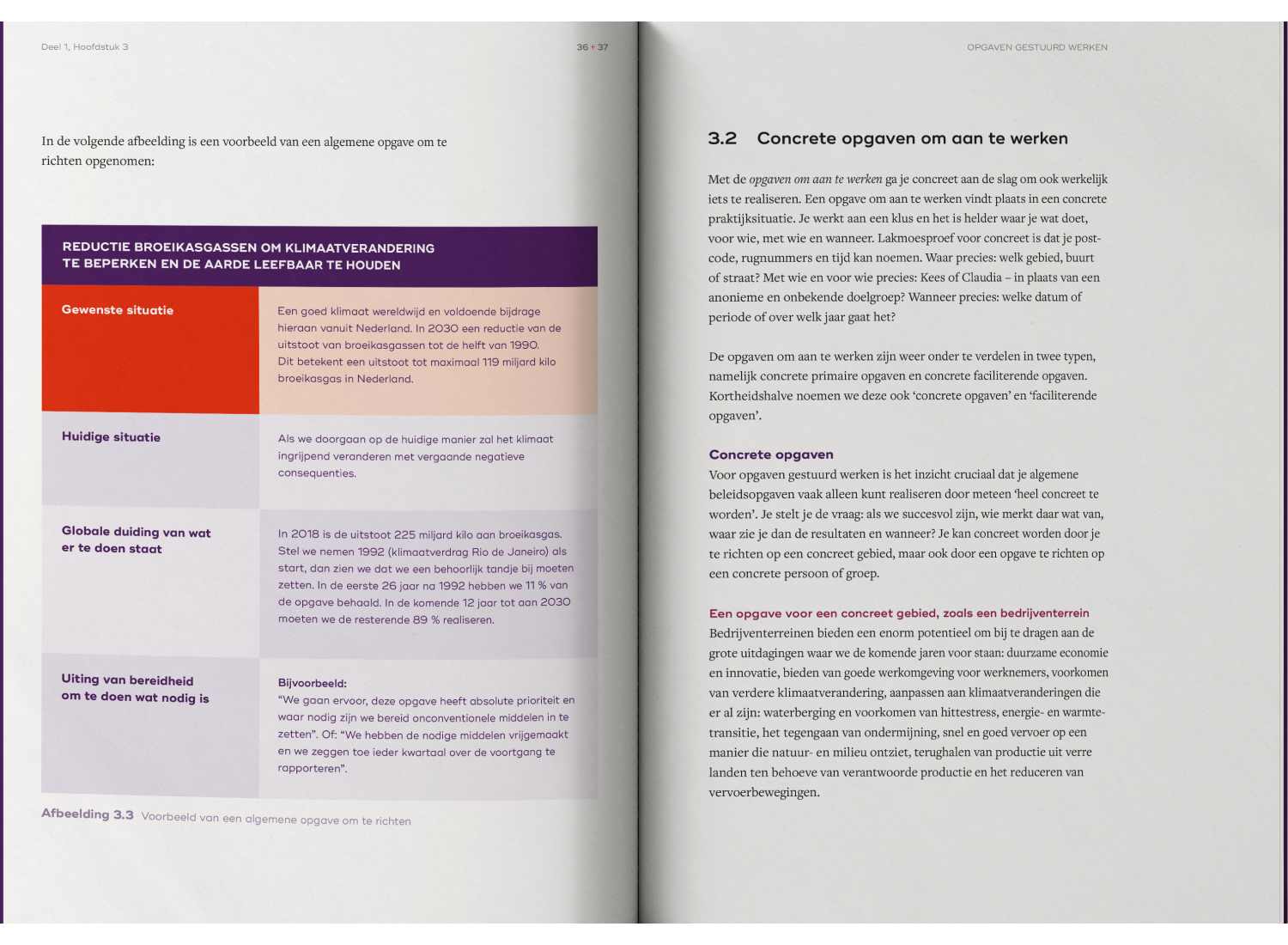 Essentieel voor opgaven gestuurd werken is het onderscheid tussen opgaven om te richten en opgaven om aan te werken. De eerste groep is algemeen en abstract en de tweede is specifiek en concreet.