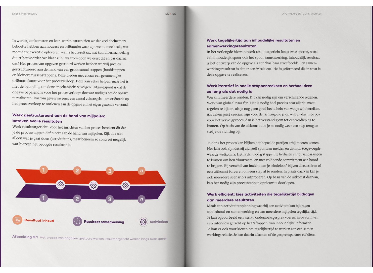 Het eerste deel, Opgaven gestuurd werken in vogelvlucht, biedt een eerste overzicht over het geheel. Dit deel is gelaagd opgebouwd. We kijken eerst wat de term ‘opgave’ inhoudt en wat deze term betekent voor de werkwijze. Vervolgens komt de werkwijze aan de orde als je deze toepast op één opgave: wat zijn dan de basisprincipes, hoe werk je samen als onderdeel van je dagelijkse werkwijze en welke processen doorloop je? In de derde sectie belichten we de werkwijze als je met elkaar aan meerdere opgaven tegelijkertijd werkt: hoe programmeer je deze opgaven en hoe organiseer je het werk?